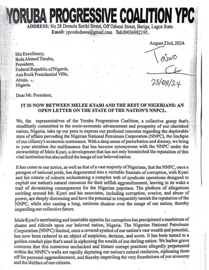 “We, the Yoruba Progressives Coalition, urge you Mr. President, to take immediate and resolute action to rectify this situation, restore the faith of the Nigerian people in your administration and the NNPCL, and revive the organization from the clutches of nefarious elements who have been plundering our natural resources with impunity.